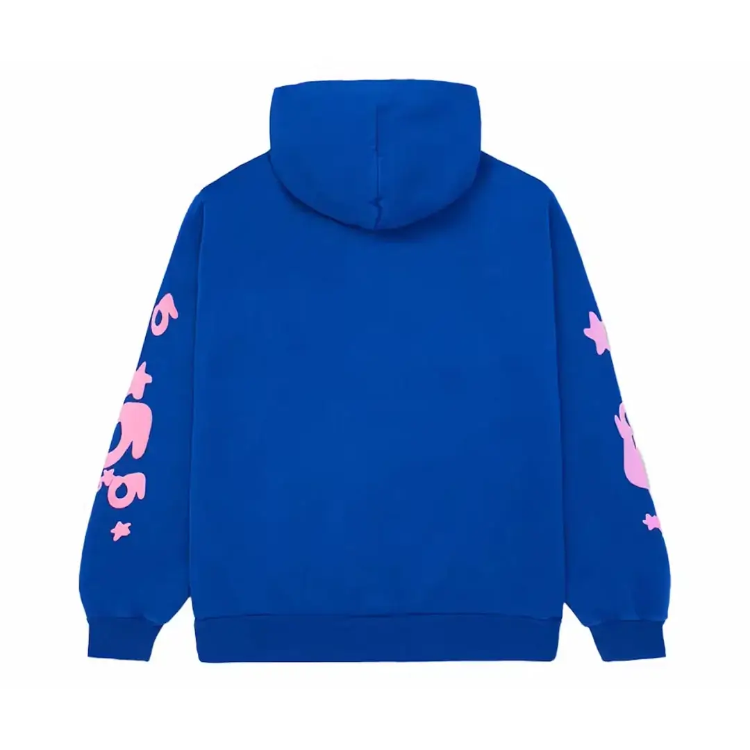 The Sp5der Beluga Hoodie in Blue is a bold, stylish statement piece that elevates your streetwear game. Featuring a vibrant royal blue base and playful pink graphics, this Spider hoodie showcases Sp5der’s signature avant garde style.