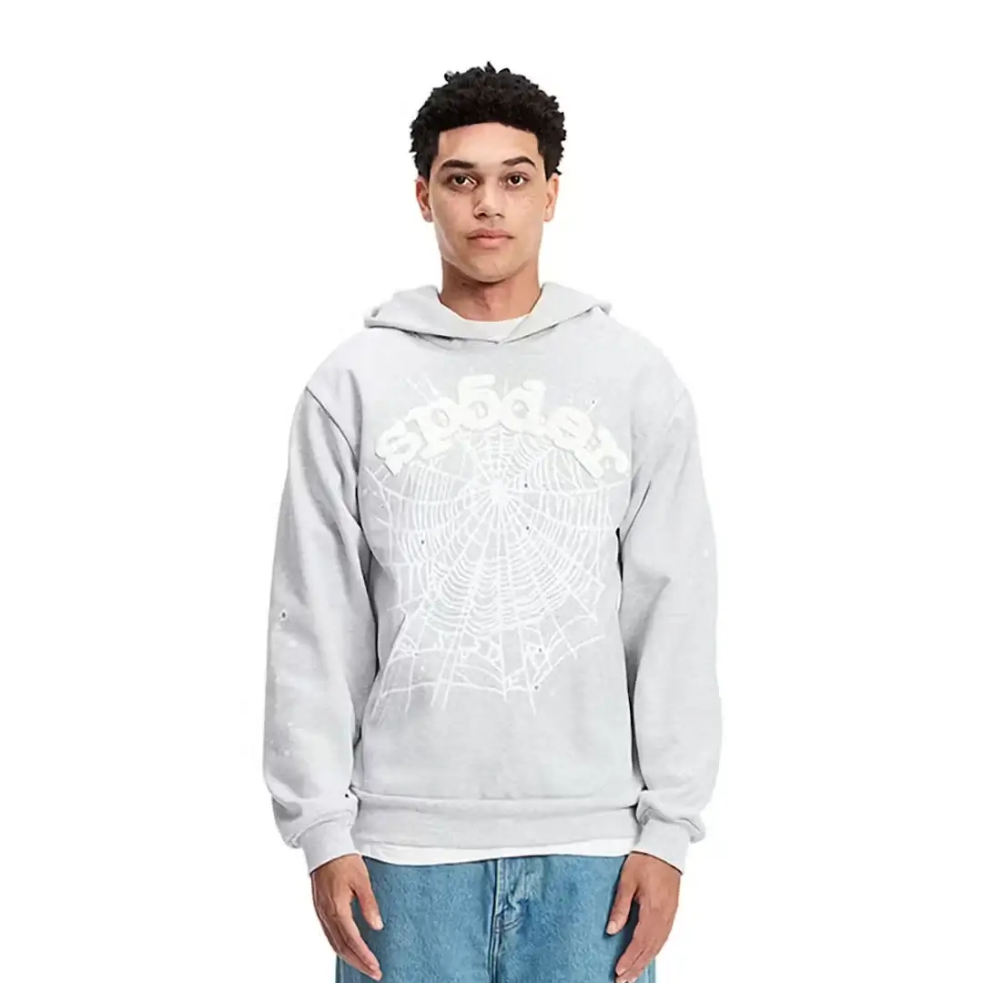 The Sp5der OG Web Hoodie Heather Grey is a hooded sweatshirt from Young Thug’s streetwear label, defined by a restrained yet distinctive design. It features a light heather grey base that blends seamlessly with the white graphics across the front. The Sp5der hoodie name is placed in a curved formation across the chest in a textured white print, while a large spider web graphic anchors the center of the hoodie, extending toward the kangaroo pocket where the branding is subtly worked into the design.
