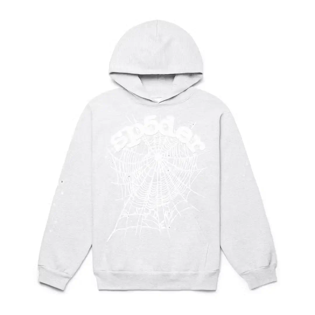 Small white star details frame the web and continue along both sleeves, adding quiet dimension without disrupting the overall balance. The back is intentionally left free of graphics, reinforcing a clean and composed finish. The contrast between the soft grey fabric and the white detailing creates a refined, bright appearance that feels considered rather than overstated. The Sp5der OG Web Hoodie Heather Grey was released on December 27, 2023.