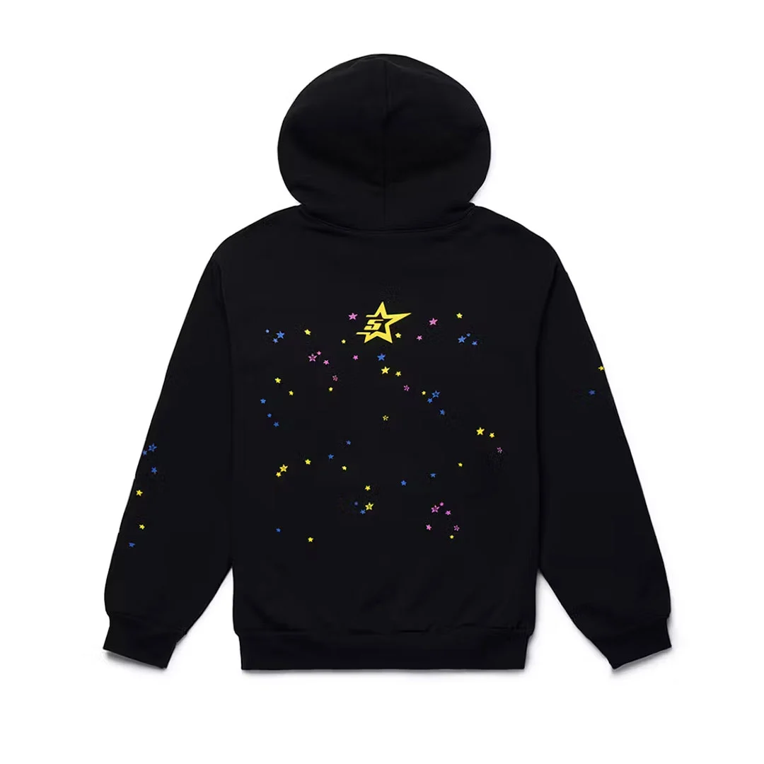 The Sp5der P*NK V2 Hoodie Black is designed to offer long lasting comfort with a bold visual identity. Made from durable fabric, this hoodie features a black base highlighted by a faded spiderweb graphic and bright color accents that stand out without overpowering the design. It comes in a relaxed pullover fit with ribbed cuffs and hem to help maintain shape and durability through regular wear and washing. A kangaroo pocket adds everyday practicality for carrying small essentials. The most noticeable detail is the bright pink Sp5der branding printed across the chest, giving the hoodie a strong and recognizable finish. This model was originally released on November 24, 2023, with a retail price of $200 and remains a standout option for those looking for a visually distinct yet wearable Sp5der hoodie.