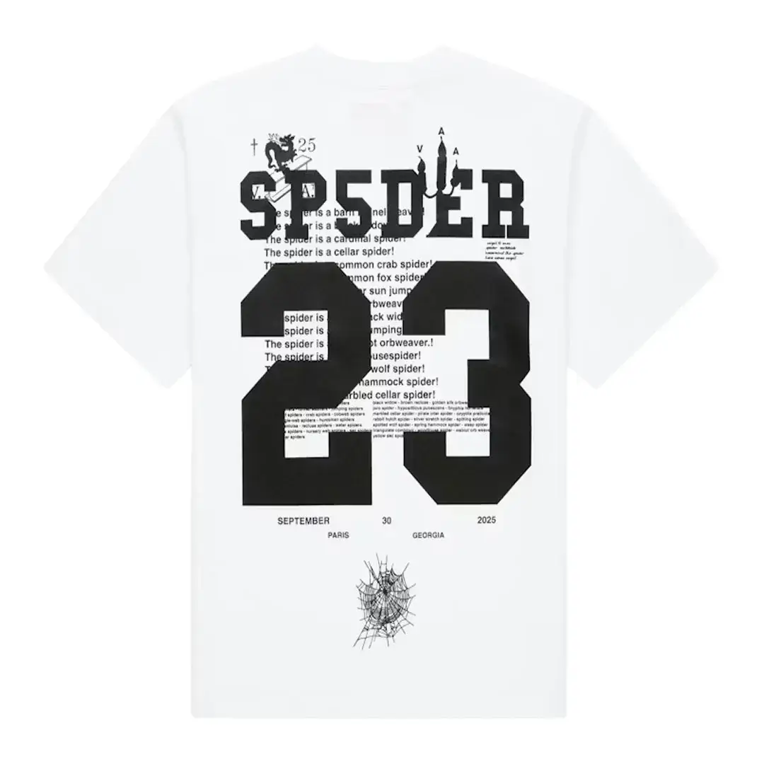 On the back, the tee showcases large “SP5DER 23” varsity style numbers layered with graphic text and spider-inspired details. A subtle spider web graphic near the lower back completes the design and highlights the brand’s signature identity.