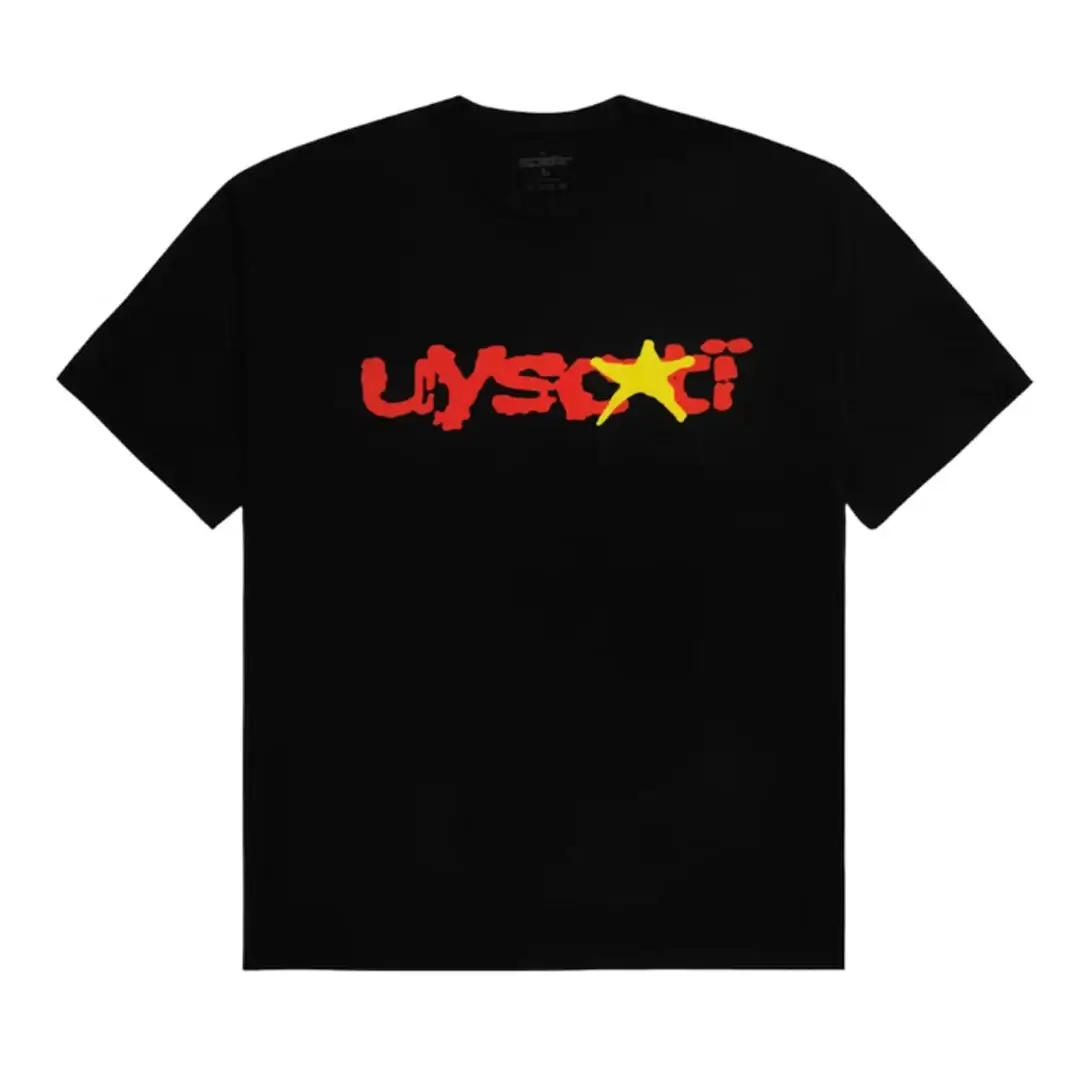 The Sp5der x UY SCUTI Graphic Tee in Black delivers bold streetwear energy with a clean, minimalist base From Spider Hoodie Official Website. Crafted in a classic black colorway, this short-sleeve T-shirt features a striking UY SCUTI logo across the chest, highlighted by a vivid yellow star graphic for standout contrast. The brushstroke-style print adds an edgy, artistic feel that aligns perfectly with modern street fashion.